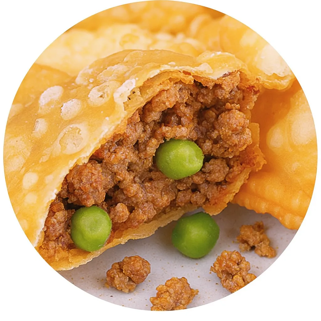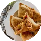 A medium samosa, smashed & topped with homemade spices, yogurt, chickpeas & chutney.