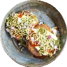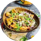 Potato patties topped with onion, potatoes, chickpeas & chutney.