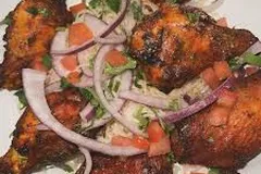 Traditional marinated chicken chunks cooked in a traditional oven and served over rice. Topped with tomato, onion and a sprinkle of chaat masala