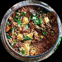 (Boneless lamb sautéed in onions & spices, layered with long grain basmati rice & topped with grilled onions, ginger and lime)