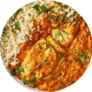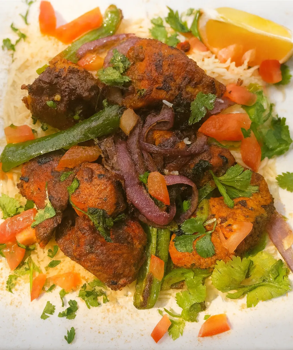 Traditional marinated lamb chunks cooked in a traditional oven and served over rice. Topped with tomato, onion and a sprinkle of chaat masala