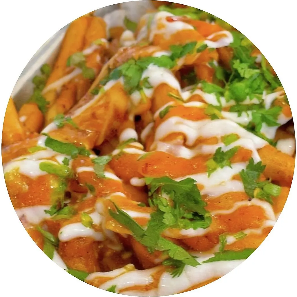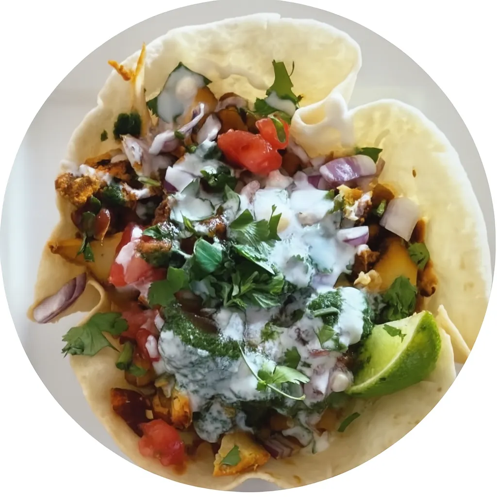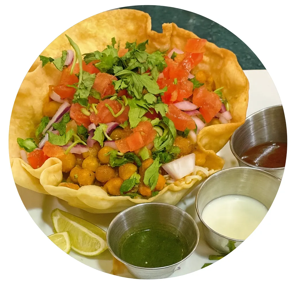 10" Fried Tortilla Bowl with basmati rice & choice of veg curry. Topped with onions, tomatoes, jalapenos, cilantro, green & red chutney, and yogurt.