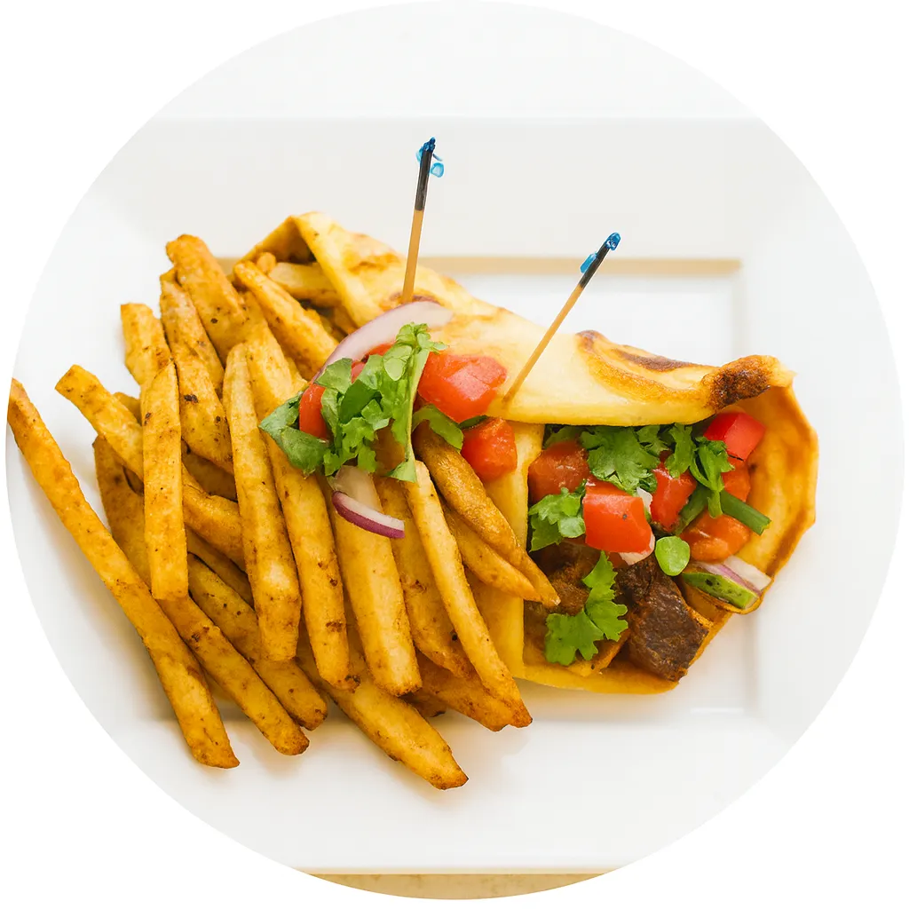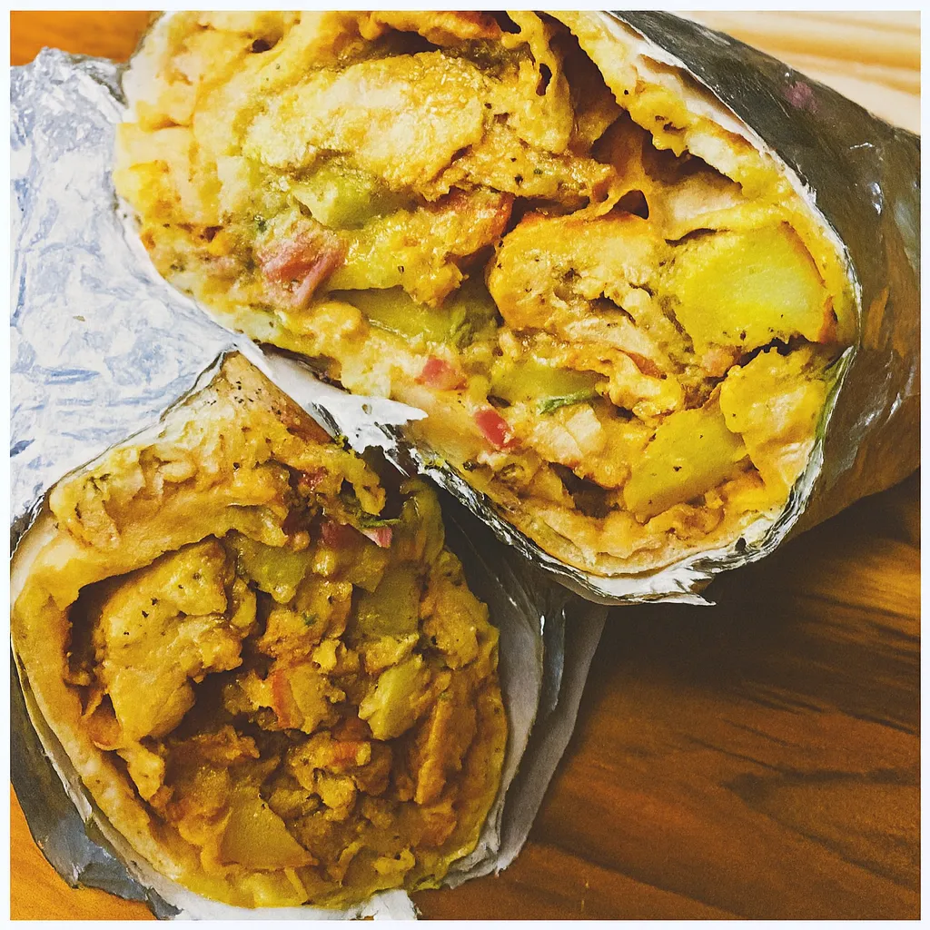 (your choice of protein mixed with long grain basmati rice and topped with diced tomato, chopped onion and green chutney, wrapped in a soft warm tortilla)